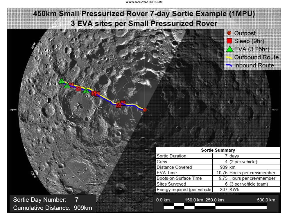 Doing some overdue reading on developments in the space explo arena, I am struck by below slides depicting an assessment of possible Lunar sorties in NASA's latest Lunar Architecture update (Sep'07). They give a pretty good first grasp of the distances involved when future astronauts r gonna have a great time driving around the Lunar surface with their Moon buggies. Looking forward to joining them near real time from behind my computer (with only a 1.5 sec lightspeed delay). Another report text worth a look at is the Global Exploration Strategy (May'07) as it provides an interesting (albeit somewhat romantic) view of space explo in an effort to globally coordinate space exploration agendas into a global exploration strategy. Harnessing the collective space intelligence...